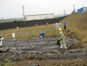 今回、5月3日(土)にサツマイモの苗植えの準備に参加させていただきました。私達ひざし職員(8名)は8時30分からの参加でしたが、すでに多くの方が老若男女問わず参加されており、後から聞いたところ、ひざし職員も含めて50名近くの方が参加されていたそうです。